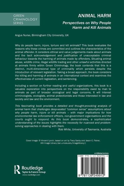 'This fascinating book provides a detailed and thought-provoking analysis of animal harm that challenges deep seated common sense assumptions about why people harm, injure or kill animals - with major implications for how environmental law enforcement officers, non-government organisations and the courts ought to respond. As this book demonstrates, a sophisticated understanding of the issues highlights the necessity for nuanced and problem-solving approaches in dealing with them.' Rob White, University of Tasmania, Australia 'The author provides an insight into how crimes against animals contain not only legal, but also moral, gendered and cultural dimensions. This book will be a very important contribution to the study of animal abuse and will fill a gap for many green criminologists and others studying this field.' Ragnhild Sollund, University of Oslo, Norway 'This book brilliantly synthesizes studies of criminal typology of offender types to those entities and individuals who commit animal harm worldwide across species, domestic and wild, to develop a green criminological agenda that recognizes animal harm as social harm and provides greater protection for all animals to promote the public good.' Joan Schaffner, George Washington University, USA 'Angus Nurse highlights the destructive implications of Government policies that simultaneously weaken anti-cruelty regulations while relying on a punishment-as-deterrence approach to criminal justice policy. He makes a convincing  case for an end to official complacency towards cruelty to animals, and the need for a holistic, multi-faceted approach to tackle animal harm.' Dan Lyons, Centre for Animals & Social Justice and University of Sheffield, UK