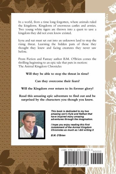 An Epic Adventure that will have young readers hooked page by page. This is the first book in the Animal Kingdom Chronicles series. The stories, characters and adventures are based in a time where animals roamed a Kingdom named Animarian. But these animals were not as we know them today. From a time long forgotten these animals walked and talked like we humans do today. From a medieval setting this book joins the story at the point of two young white tigers that are thrown into a quest and adventure to save a kingdom they did not even realize they lived in and did not know about. They learn many truths about themselves and those around them that they thought they knew. Facing their fears, confronting new unexpected challenges and succeeding against all odds are just some of the elements they must face.