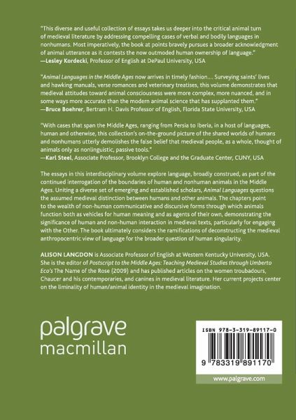 "The twelve essays collected in this volume comprise a varied and stimulating contribution to the thriving field of scholarly discourse on medieval 'animalities' ... . Their general focus is on medieval representations of animal utterances and other non-verbal modes of communication in order to interrogate medieval attitudes to the supposed dichotomy between human and non-human animals." (David Scott-Macnab, Modern Language Review, Vol. 114 (3), July, 2019)