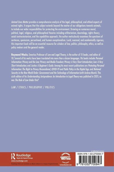 Animal Lives Matter provides a comprehensive analysis of the legal, philosophical, and ethical aspects of animal rights. It argues that the subject extends beyond the matter of our obligations towards animals, to include our wider responsibilities for protecting the environment. Drawing on numerous moral, political, legal, religious, and philosophical theories including utilitarianism, deontology, rights theory, social contractarianism, and the capabilities approach, the author meticulously examines the questions of sentience, speciesism, personhood, and human exceptionalism. Lucid, nuanced, and academically rigorous, this important book will be an essential resource for scholars of law, politics, philosophy, ethics, as well as policy makers and the general reader.