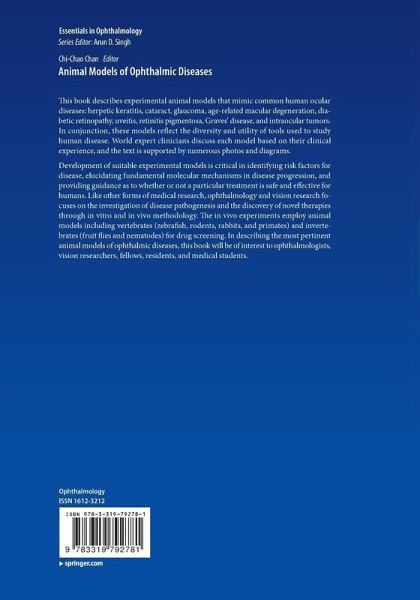 1. Animal Models of Herpetic Keratitis; 2. ANIMAL MODELS OF CATARACTS; 3. Animal Models of Glaucoma; 4. Animal Models Age-Related Macular Degeneration; 5. Animal Models of Age-Related Macular Degeneration: Subretinal Inflammation; 6. Animal models of diabetic retinopathy; 7. Animal Models of autoimmune uveitis; 8. Animal Models of Retinitis Pigmentosa; 9. Animal Model of Graves' Orbitopathy 10. Animal models of ocular tumors; 11. Epilogue.