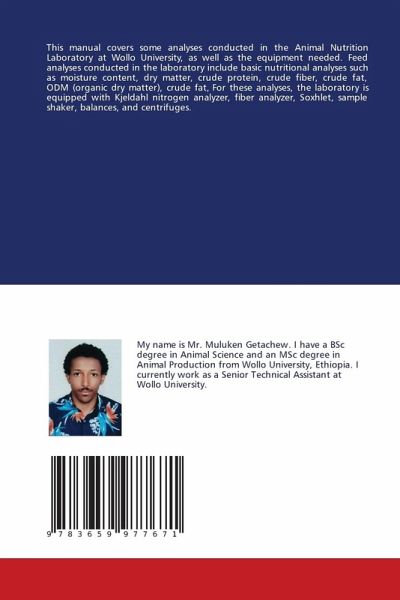 This manual covers some analyses conducted in the Animal Nutrition Laboratory at Wollo University, as well as the equipment needed. Feed analyses conducted in the laboratory include basic nutritional analyses such as moisture content, dry matter, crude protein, crude fiber, crude fat, ODM (organic dry matter), crude fat, For these analyses, the laboratory is equipped with Kjeldahl nitrogen analyzer, fiber analyzer, Soxhlet, sample shaker, balances, and centrifuges.