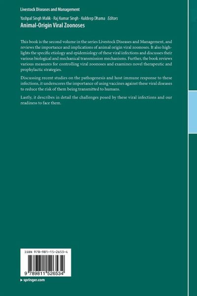 This book is the second volume in the series Livestock Diseases and Management, and reviews the importance and implications of animal origin viral zoonoses. It also highlights the specific etiology and epidemiology of these viral infections and discusses their various biological and mechanical transmission mechanisms. Further, the book reviews various measures for controlling viral zoonoses and examines novel therapeutic and prophylactic strategies. Discussing recent studies on the pathogenesis and host immune response to these infections, it underscores the importance of using vaccines against these viral diseases to reduce the risk of them being transmitted to humans.Lastly, it describes in detail the challenges posed by these viral infections and our readiness to face them.