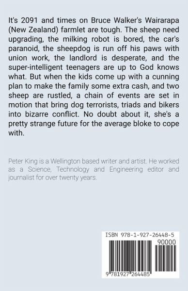 It's 2091 and times on Bruce Walker's Wairarapa (New Zealand) farmlet are tough. The sheep need upgrading, the milking robot is bored, the car's paranoid, the sheepdog is run off his paws with union work, the landlord is desperate, and the super-intelligent teenagers are up to God knows what. But when the kids come up with a cunning plan to make the family some extra cash, and two sheep are rustled, a chain of events are set in motion that bring dog terrorists, triads and bikers into bizarre conflict. No doubt about it, she's a pretty strange future for the average bloke to cope with. A comedy tale colliding genetic engineering, robotics and New Zealand's farming culture and heritage with its changing geopolitical role in the Pacific.