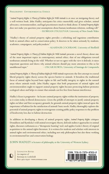 Animal Property Rights: A Theory of Habitat Rights for Wild Animals represents the first attempt to extend liberal property rights theory across the species barrier to animals. It broadens the traditional focus of animal rights beyond basic rights to life and bodily integrity to rights to the natural areas in which animal reside. John Hadley argues that both proponents of animal rights and environmentalists ought to support animal property rights because protecting habitat promotes ecological values and helps to ensure animals live free from human interference. Hadley's focus is pragmatist - he locates animal property rights within the institution of property as it exists today in liberal democracies. He argues that attempts to justify animal property rights on labor and first occupancy grounds will likely fail; instead, he grounds animal property rights upon the importance of habitat for the satisfaction of animals' basic needs. The potential of animal property rights as a way of reinvigorating existing public policy responses to the problem of biodiversity loss due to habitat destruction is thoroughly explored. Using the concept of guardianship for cognitively impaired human beings, Hadley translates habitat rights as a right to negotiate - human guardians ought to be allowed to negotiate, on behalf of wild animals, with human landholders whose development activities put animals at risk. In addition to a theory of animal property rights, Animal Property Rights affords a critique of Donaldson and Kymlicka's wild animal sovereignty theory, a defence of indirect approaches to animal rights, an extensive discussion of euthanasia as a 'therapeutic hunting' tool, and the first discussion of Locke's theory of original acquisition in animal rights literature.