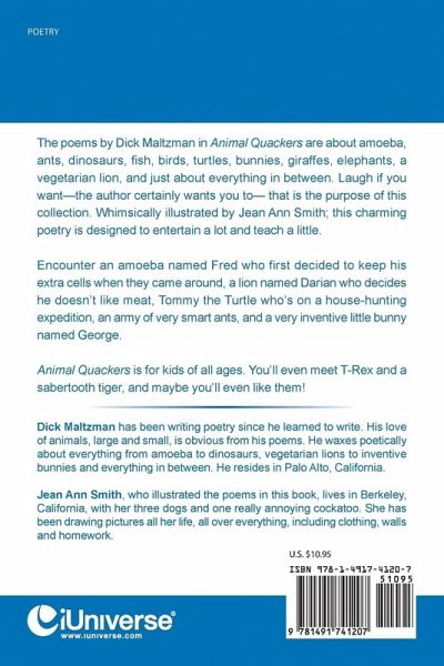 The poems by Dick Maltzman in Animal Quackers are about amoeba, ants, dinosaurs, fish, birds, turtles, bunnies, giraffes, elephants, a vegetarian lion, and just about everything in between. Laugh if you want—the author certainly wants you to— that is the purpose of this collection. Whimsically illustrated by Jean Ann Smith; this charming poetry is designed to entertain a lot and teach a little. Encounter an amoeba named Fred who first decided to keep his extra cells when they came around, a lion named Darian who decides he doesn’t like meat, Tommy the Turtle who’s on a house-hunting expedition, an army of very smart ants, and a very inventive little bunny named George. Animal Quackers is for kids of all ages. You’ll even meet T-Rex and a sabertooth tiger, and maybe you’ll even like them!