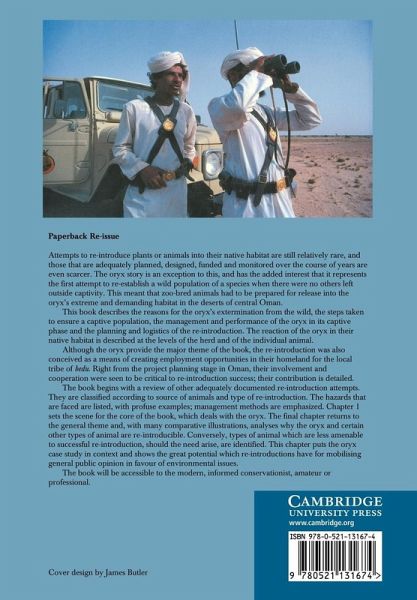 When this book was first published in 1989, attempts to reintroduce plants or animals into their native habitat were still relatively rare, and those that were adequately planned, designed, funded and monitored over the course of years are even scarcer. The oryx story is an exception to this, and has the added interest that it represents the first attempt to re-establish a wild population of a species when there were no others left outside captivity. This meant that zoo-bred animals had to be prepared for release into the oryx's extreme and demanding habitat in the deserts of central Oman. This book will be accessible to the informed conservationist, amateur or professional.