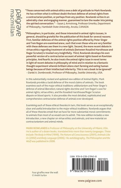 'Philosophers, in particular, and those interested in animal rights issues, in general, should be grateful for the publication of this book for several reasons. First, familiar defenses of the animal rights position offered by Peter Singer and Tom Regan are examined anew, such that even those who are very familiar with these defenses see them in a new light. Second, the more recent debate in virtue ethics regarding treatment of animals (between Rosalind Hursthouse and Roger Scruton) is treated very insightfully. Third, Rowlands develops his own powerful version of a contractarian account of animal rights based on Rawlsian principles. And fourth, he also treats the animal rights issue in novel terms in light of recent debates in philosophy of mind and in relation to a fantastic thought experiment wherein brilliant aliens start farming and eating human beings because of their intellectual inferiority. This is not a book to be ignored!' - Daniel A. Dombrowski, Professor of Philosophy, Seattle University, USA