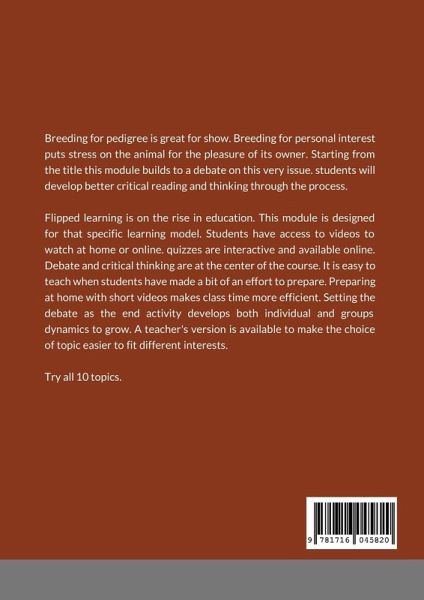 This is one module of 10 that can be used in flipped learning class. the topic of breeding for personal pleasure often results in health issues for the animal. Working through the 10 sections will develop critical thinking and confidence. Flipped learning classes require videos that are on the homepage. Links to videos and quizzes are in the book. A teacher's edition is also available with extra support.