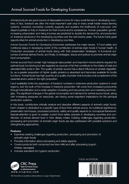 Animal products are good source of disposable income for many small farmers in developing countries. In fact, livestock are often the most important cash crop in many small holder mixed farming systems. Livestock ownership currently supports and sustains the livelihoods of rural poor, who depend partially or fully on livestock for their income and/or subsistence. Human population growth, increasing urbanization and rising incomes are predicted to double the demand for, and production of, livestock products in the developing countries over the next twenty years. The future holds great opportunities for animal production in developing countries. Animal Sourced Foods for Developing Economies addresses five major issues: 1) Food safety and nutritional status in developing world; 2) the contribution of animal origin foods in human health; 3) Production processes of animal foods along with their preservation strategies; 4) functional outcomes of animal derived foods; and finally, 5) strategies, issues and polices to promote animal origin food consumption. Animal sourced food contain high biological value protein and important micronutrients required for optimal body functioning but are regarded as sources of fat that contribute to the intake of total and saturated fatty acids in diet. The quality of protein source has a direct influence on protein digestibility, as a greater proportion of higher quality proteins is absorbed and becomes available for bodily functions. Animal foods has high quantity and quality of protein that includes a full complement of the essential amino acids in the right proportion. Land availability limits the expansion of livestock numbers in extensive production systems in most regions, and the bulk of the increase in livestock production will come from increased productivity through intensification and a wider adoption of existing and new production and marketing technologies. The significant changes in the global consumption and demand for animal source foods, along with increasing pressures on resources, are having some important implications for the principal production systems. In this book, contributors critically analyze and describe different aspects of animal's origin foods. Each chapter is dedicated to a specific type of food from animal source, its nutritional significance, preservation techniques, processed products, safety and quality aspects on conceptual framework. Special attention is given to explain current food safety scenario in developing countries and contribution of animal derived food in their dietary intake. Existing challenges regarding production, processing and promotion of animal's origin foods are also addressed with possible solutions and strengthening approaches.