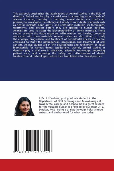 This textbook emphasizes the applications of Animal studies in the field of dentistry. Animal studies play a crucial role in advancing various fields of science, including dentistry. In dentistry, animal studies are conducted primarily to investigate the efficacy and safety of new dental materials such as dental implants, bone grafts, and restorative materials, its techniques, treatments, and devices before they are applied to human patients. Animals are used to assess the biocompatibility of dental materials. These studies evaluate the tissue response, inflammation, and healing processes associated with these materials. Animal models are also utilized to study the etiology, progression, and treatment of periodontal diseases. They are employed to study the pathogenesis, progression and treatment of oral cancers. Animal studies aid in the development and refinement of novel biomaterials for various dental applications. Overall, animal studies in dentistry play a vital role in advancing scientific knowledge, improving patient care, and ensuring the safety and effectiveness of dental treatments and technologies before their translation into clinical practice.
