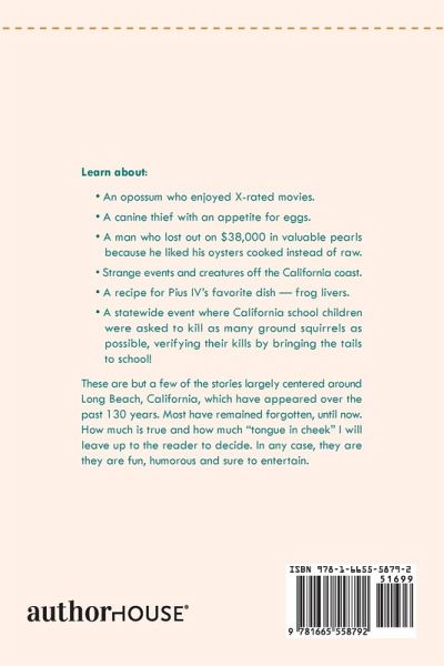 Learn about: ¿ An opossum who enjoyed X-rated movies. ¿ A canine thief with an appetite for eggs. ¿ A man who lost out on $38,000 in valuable pearls because he liked his oysters cooked instead of raw. ¿ Strange events and creatures off the California coast. ¿ A recipe for Pius IV's favorite dish - frog livers. ¿ A statewide event where California school children were asked to kill as many ground squirrels as possible, verifying their kills by bringing the tails to school! These are but a few of the stories largely centered around Long Beach, California, which have appeared over the past 130 years. Most have remained forgotten, until now. How much is true and how much "tongue in cheek" I will leave up to the reader to decide. In any case, they are they are fun, humorous and sure to entertain.