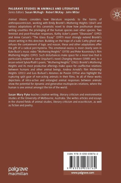 Animal Visions considers how literature responds to the harms of anthropocentricism, working with Emily Brontë's Wuthering Heights (1847) and various adaptations of this canonistic novel to show how posthumanist dream writing unsettles the privileging of the human species over other species. Two feminist and post-Freudian responses, Kathy Acker's poem "Obsession" (1992) and Anne Carson's "The Glass Essay" (1997) most strongly extend Brontë's dream writing in this direction. Building on the trope of a ludic Cathy ghost who refuses the containment of logic and reason, these and other adaptations offer the gift of a radical peri-hysteria. This emotional excess is most clearly seen in Kate Bush's music video "Wuthering Heights" (1978) and Peter Kosminsky's film Wuthering Heights (1992). Such disturbances make space for a moor love that is particularly evident in Jane Urquhart's novel Changing Heaven (1989) and, to a lesser extent Sylvia Plath's poem, "Wuthering Heights" (1961). Brontë's Wuthering Heights and its most productive afterings make space for co-affective relations between humans and other animal beings. Andrea Arnold's film Wuthering Heights (2011) and Luis Buñuel's Abismos de Pasión (1954) also highlight the rupturing split gaze of non-acting animals in their films. In all of these works depictions of intra-active and entangled responses between animals show the potential for dynamic and generative multispecies relations, where the human is one animal amongst the kin of the world.