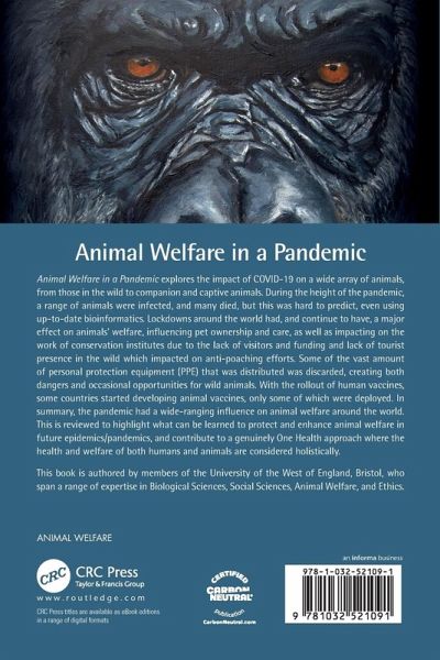 Animal Welfare in a Pandemic explores the impact of COVID-19 on a wide array of animals, from those in the wild to companion and captive animals. During the height of the pandemic, a range of animals were infected, and many died, but this was hard to predict, even using up-to-date bioinformatics. Lockdowns around the world had, and continue to have, a major effect on animals' welfare, influencing pet ownership and care, as well as impacting on the work of conservation institutes due to the lack of visitors and funding and lack of tourist presence in the wild which impacted on anti-poaching efforts. Some of the vast amount of personal protection equipment (PPE) that was distributed was discarded, creating both dangers and occasional opportunities for wild animals. With the rollout of human vaccines, some countries started developing animal vaccines, only some of which were deployed. In summary, the pandemic had a wide-ranging influence on animal welfare around the world. This is reviewed to highlight what can be learned to protect and enhance animal welfare in future epidemics/pandemics, and contribute to a genuinely One Health approach where the health and welfare of both humans and animals are considered holistically.
