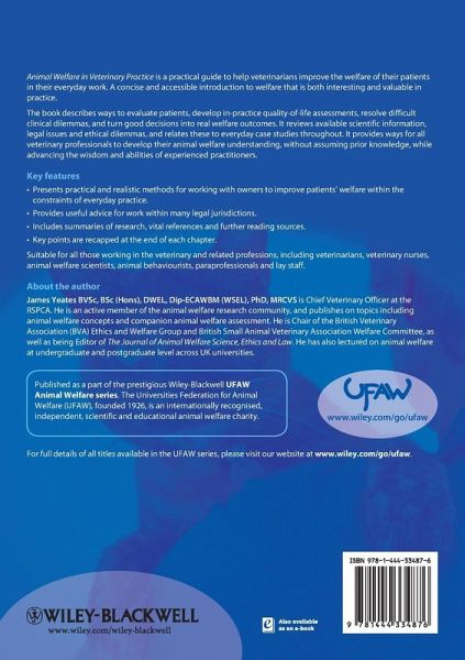 The book describes ways to evaluate patients, develop in-practice quality of life assessments, resolve difficult clinical dilemmas, and turn good decisions into real welfare outcomes. It reviews available scientific information, legal issues and ethical dilemmas, and relates these to everyday case studies throughout. It provides ways for all veterinary professionals to develop their animal welfare understanding, without assuming prior knowledge, while advancing the wisdom and abilities of experienced practitioners.
