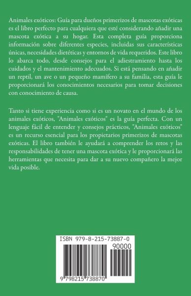 Animales exóticos: Guía para dueños primerizos de mascotas exóticas es el libro perfecto para cualquiera que esté considerando añadir una mascota exótica a su hogar. Esta completa guía proporciona información sobre diferentes especies, incluidas sus características únicas, necesidades dietéticas y entornos de vida requeridos. Este libro lo abarca todo, desde consejos para el adiestramiento hasta los cuidados y el mantenimiento adecuados. Si está pensando en añadir un reptil, un ave o un pequeño mamífero a su familia, esta guía le proporcionará los conocimientos necesarios para tomar decisiones con conocimiento de causa. Tanto si tiene experiencia como si es un novato en el mundo de los animales exóticos, "Animales exóticos" es la guía perfecta. Con un lenguaje fácil de entender y consejos prácticos, "Animales exóticos" es un recurso esencial para los propietarios primerizos de mascotas exóticas. El libro también le ayudará a comprender los retos y las responsabilidades de tener una mascota exótica y le proporcionará las herramientas que necesita para dar a su nuevo compañero la mejor vida posible.