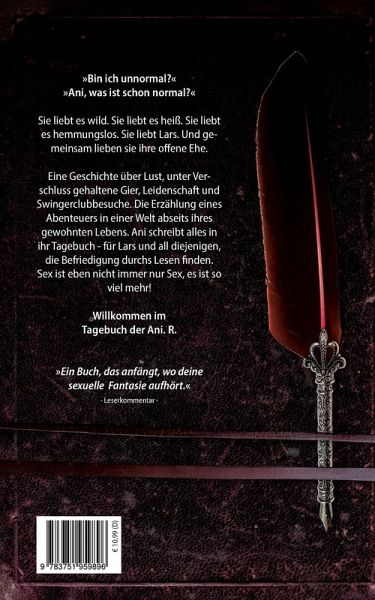 "Bin ich unnormal?""Ani, was ist schon normal?"Sie liebt es wild. Sie liebt es heiß. Sie liebt es hemmungslos. Sie liebt Lars. Und gemeinsam lieben sie ihre offene Ehe.Eine Geschichte über Lust, unter Verschluss gehaltene Gier, Leidenschaft und Swingerclubbesuche. Die Erzählung eines Abenteuers in einer Welt abseits ihres gewohnten Lebens. Ani schreibt alles in ihr Tagebuch - für Lars und all diejenigen, die Befriedigung durchs Lesen finden. Sex ist eben nicht immer nur Sex, es ist so viel mehr!Willkommen im Tagebuch der Ani R.Ein Buch, das anfängt, wo deine sexuelle Fantasie aufhört.