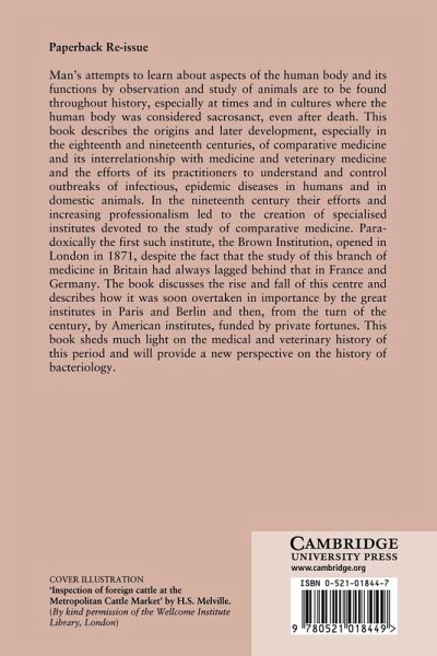 Man's attempts to learn about aspects of the human body and its functions by observation and study of animals are to be found throughout history, especially at times and in cultures where the human body was considered sacrosanct, even after death. This book describes the origins and later development, especially in the eighteenth and nineteenth centuries, of comparative medicine and its interrelationship with medicine and veterinary medicine and the efforts of its practitioners to understand and control outbreaks of infectious, epidemic diseases in humans and in domestic animals. In the nineteenth century their efforts and increasing professionalism led to the creation of specialised institutes devoted to the study of comparative medicine. Paradoxically the first such institute, the Brown Institution, opened in London in 1871, despite the fact that the study of this branch of medicine in Britain had always lagged behind that in France and Germany. The book discusses the rise and fall of this centre and describes how it was soon overtaken in importance by the great institutes in Paris and Berlin and then, from the turn of the century, by American institutes, funded by private fortunes. This book sheds much new light on the medical and veterinary history of this period and will provide a new perspective on the history of bacteriology.