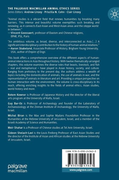 Chapter 1. Introduction: Animals and Human Society in Asia: An Overview and Premises. Rotem Kowner, Guy Bar-Oz, Michal Biran, Meri Shahar and Gideon Shelach-Lavi.- Part I: Hunting and Domestication.- Chapter 2. When Elephants Roamed Asia: The Significance of Proboscideans in Diet, Culture and Cosmology in Paleolithic Asia. Ran Barkai.- Chapter 3. Hunting to Herding to Trading to Warfare: A Chronology of Animal Exploitation in the Negev. Steven A. Rosen.- Chapter 4. Domestication of the Donkey (Equus asinus) in the Southern Levant: Archaeozoology, Iconography and Economy. Ianir Milevski and Liora Kolska Horwitz.- Part II: Animals as Food.- Chapter 5. Spilling Blood: Conflict and Culture over Animal Slaughter in Mongol Eurasia. Timothy May.- Chapter 6. China's Dairy Century: Making, Drinking and Dreaming of Milk. Thomas David DuBois.- Chapter 7. Tuna as Economic Resource and Symbolic Capital in Japan's "Imperialism of the Sea". Nadin Heé.- Part III: Animals at War.- Chapter 8.Elephants in Mongol History: From Military Obstacles to Symbols of Buddhist Power. William G. Clarence-Smith.- Chapter 9. The Mamluk's Best Friend: The Mounts of the Military Elite of Egypt and Eurasian Steppe in the Late Middle-Ages. Reuven Amitai and Gila Kahila Bar-Gal.- Chapter 10. A Million Horses: Raising Government Horses in Early Ming China. Noa Grass.- Part IV: Animals in Culture and Religion.- Chapter 11: From Lion to Tiger: The Changing Buddhist Images of Apex Predators in Trans-Asian Contexts. Xing Zhang and Huaiyu Chen.- Chapter 12. The Chinese Cult of the Horse King, Divine Protector of the Equines. Meir Shahar.- Chapter 13. Animal Signs: Therimorphic Intercession between Heaven and Imperial Mongolian History. Brian Baumann.