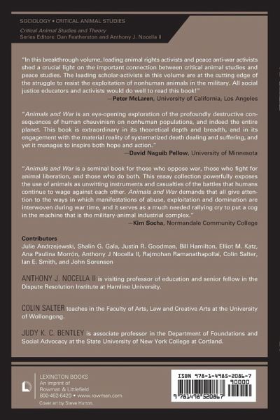 Animals and War: Confronting the Military-Animal Industrial Complex is the first book to examine how nonhuman animals are used in war and the military. Animals and War contributes significantly to the fields of social justice, animal rights, and anti-war/peace activist communities. This book also will be read by peace, conflict, social justice, and critical animal studies scholars, students, and practitioners.