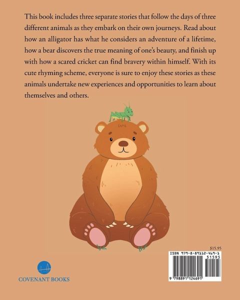 This book includes three separate stories that follow the days of three different animals as they embark on their own journeys. Read about how an alligator has what he considers an adventure of a lifetime, how a bear discovers the true meaning of one's beauty, and finish up with how a scared cricket can find bravery within himself. With its cute rhyming scheme, everyone is sure to enjoy these stories as these animals undertake new experiences and opportunities to learn about themselves and others.