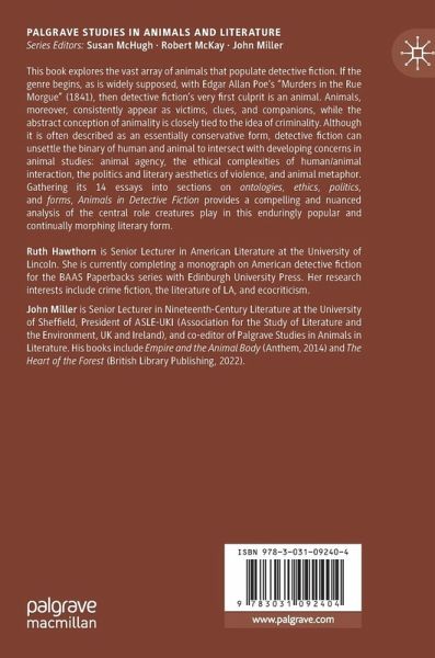 This book explores the vast array of animals that populate detective fiction. If the genre begins, as is widely supposed, with Edgar Allan Poe's "Murders in the Rue Morgue" (1841), then detective fiction's very first culprit is an animal. Animals, moreover, consistently appear as victims, clues, and companions, while the abstract conception of animality is closely tied to the idea of criminality. Although it is often described as an essentially conservative form, detective fiction can unsettle the binary of human and animal to intersect with developing concerns in animal studies: animal agency, the ethical complexities of human/animal interaction, the politics and literary aesthetics of violence, and animal metaphor. Gathering its 14 essays into sections on ontologies, ethics, politics, and forms, Animals in Detective Fiction provides a compelling and nuanced analysis of the central role creatures play in this enduringly popular and continually morphing literary form.