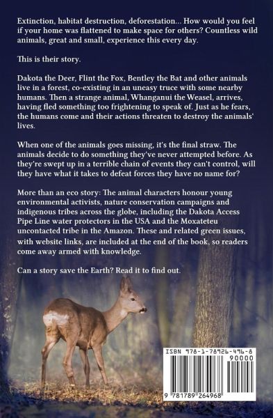 Fans of the children's literature classic, Watership Down, will be glad that animals have a voice again. Extinction, habitat destruction, deforestation... How would you feel if your home was flattened to make space for others? Countless wild animals, great and small, experience this every day. This is their story. Dakota the Deer, Flint the Fox, Bentley the Bat and other animals live in a forest, co-existing in an uneasy truce with some nearby humans. Then a strange animal, Whanganui the Weasel, arrives, having fled something too frightening to speak of. Just as he fears, the humans come and their actions threaten to destroy the animals' lives. When one of the animals goes missing, it's the final straw. The animals decide to do something they've never attempted before. As they're swept up in a terrible chain of events they can't control, will they have what it takes to defeat forces they have no name for? More than an eco story: The animal characters honour young environmental activists, nature conservation campaigns and indigenous tribes across the globe, including the Dakota Access Pipe Line water protectors in the USA and the Moxateteu uncontacted tribe in the Amazon. These and related green issues, with website links, are included at the end of the book, so readers come away armed with knowledge. Can a story save the Earth? Read it to find out.