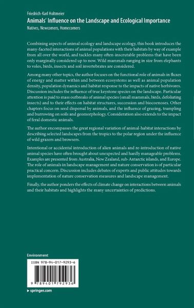 In its first English-language edition, this book introduces the many-faceted interactions of animal populations with their habitats. From soil fauna, ants and termites to small and large herbivores, burrowing mammals and birds, the author presents a comprehensive analysis of animals and ecosystems that is as broad and varied as all nature. Chapter 2 addresses the functional role of animals in landscape ecosystems, emphasizing fluxes of energy and matter within and between ecosystems, and the effects of animals on qualitative and structural habitat change. Discussion includes chapters on the role of animal population density and the impacts of native herbivores on vegetation and habitats from the tropics to the polar regions. Cyclic mass outbreaks of species such as the larch bud moth in Switzerland, the mountain pine beetle and the African red-billed weaver bird are described and analyzed. Other chapters discuss Zoochory the dispersal of seeds by ants, mammals and birds and the influence of burrowing animals on soil development and geomorphology. Consideration extends to the impact of feral domestic animals. Chapter 5 focuses on problems resulting from introduction of alien animals and from re-introduction of animal species to their original habitats, discusses the effects on ecosystems of burrowing, digging and trampling by animals. The author also addresses keystone species such as kangaroo rats, termites and beavers. Chapter 6 addresses the role of animals in landscape management and nature conservation, with chapters on the impact of newcomer species such as animals introduced into Australia, New Zealand and Europe, and the consequences of reintroduction of species to original habitat. It also discusses the carrying capacity of natural habit, public attitudes toward conversation and more. The final section ponders the effects of climate on interactions between animals and their habitats.