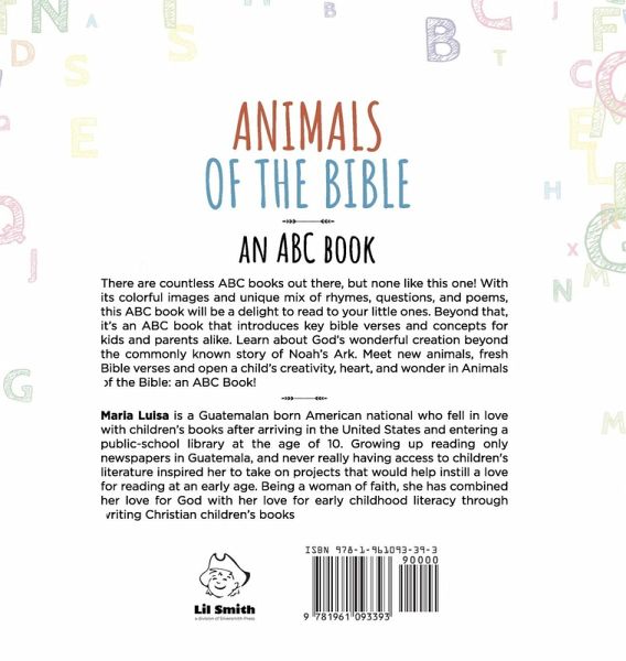 There are countless ABC books out there, but none like this one! With its colorful images and unique mix of rhymes, questions, and poems, this ABC book will be a delight to read to your little ones. Beyond that, it's an ABC book that introduces key bible verses and concepts for kids and parents alike. Learn about God's wonderful creation beyond the commonly known story of Noah's Ark. Meet new animals, fresh Bible verses and open a child's creativity, heart, and wonder in Animals of the Bible: an ABC Book!