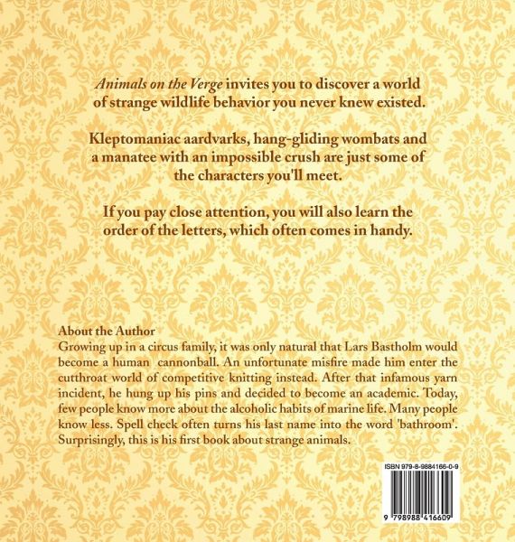 "Animals on the Verge" invite you to discover a world of strange wildlife behavior you never knew existed. Kleptomaniac aardvarks, hang-gliding wombats and a manatee with an impossible crush are just some of the characters you'll meet. If you pay close attention, you will also learn the order of the letters, which often comes in handy. Sure, they might be cute. But underneath the cuddly exterior there's more going on than meets the eye. "Animals on the Verge" began as an experiment in using AI and then developed into something else. What the AI couldn't do was gaze into the souls of the animals it helped bring to life. That part required human assistance and a keen sense of the absurd. If you enjoy the work of Gary Larsson and grew up watching Monty Python, you'll enjoy "Animals on the Verge".