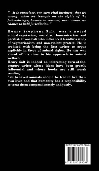 "...it is ourselves, our own vital instincts, that we wrong, when we trample on the rights of the fellow-beings, human or animal, over whom we chance to hold jurisdiction." Henry Stephens Salt was a noted ethical vegetarian, socialist, humanitarian and pacifist. It was Salt who influenced Gandhi's study of vegetarianism and non-violent protest. He is credited with being the first writer to argue explicitly in favor of animal rights. He was way ahead of his time in his approach to animal welfare. Henry Salt is indeed an interesting turn-of-the-century writer whose ideas have been greatly influential and whose books are still worth reading.Salt believed animals should be free to live their own lives and that humanity has a responsibility to treat them compassionately and justly. CONTENTS : Prefatory Note Chapter I - The Principle of Animals' Rights Chapter II - The Case of Domestic Animals Chapter III - The Case of Wild Animals Chapter IV - The Slaughter of Animals for Food Chapter V - Sport, or Amateur Butchery Chapter VI - Murderous Millinery Chapter VII - Experimental Torture Chapter VIII - Lines of Reform Appendix- Bibliography of the Rights of AnimalsThe object of the following essay is to set the principle of animals' rights on a consistent and intelligible footing, to show that this principle underlies the various efforts of humanitarian reformers, and to make a clearance of the comfortable fallacies which the apologists of the present system have industriously accumulated. While not hesitating to speak strongly when occasion demanded, I have tried to avoid the tone of irrelevant recrimination so common in these controversies, and thus to give more unmistakable emphasis to the vital points at issue. We have to decide, not whether the practice of fox-hunting, for example, is more, or less, cruel than vivisection, but whether all practices which inflict unnecessary pain on sentient beings are not incompatible with the higher instincts of humanity. I am aware that many of my contentions will appear very ridiculous to those who view the subject from a contrary standpoint, and regard the lower animals as created solely for the pleasure and advantage of man; on the other hand, I have myself derived an unfailing fund of amusement from a rather extensive study of our adversaries' reasoning. It is a conflict of opinion, wherein in time alone can adjudicate: but already there are not a few signs that the laugh will rest ultimately with the humanitarians. My thanks are due to several friends who have helped me in the preparation of this book; I may mention Mr. Ernest Bell, Mr. Kenneth Romanes, and Mr. W. E. A. Axon. My many obligations to previous writers are acknowledged in the foot-notes and appendices.