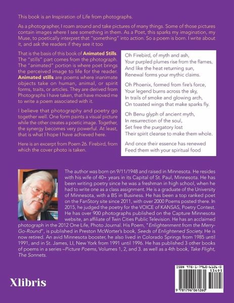 This book is an Inspiration of Life from photographs. As a photographer, I roam around and take pictures of many things. Some of those pictures contain images where I see something in them. As a Poet, this sparks my imagination, my Muse, to poetically interpret that "something" into action. So a poem is born. I write about it, and ask the readers if they see it too That is the basis of this book of Animated Stills. The "stills" part comes from the photograph. The "animated" portion is where poet brings the perceived image to life for the reader. Animated stills are poems where inanimate objects take on human, animal, or spirit forms, traits, or articles. They are derived from Photographs I have taken, that have moved me to write a poem associated with it. I believe that photography and poetry go together well. One form paints a visual picture while the other creates a poetic image. Together, the synergy becomes very powerful. At least, that is what I hope I have achieved here. Here is an excerpt from Poem 26. Firebird, from which the cover photo is taken.