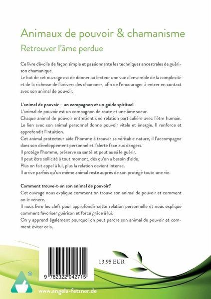 Ce livre dévoile de façon simple et passionnante les techniques ancestrales de guérison chamanique.Le but de cet ouvrage est de donner au lecteur une vue d´ensemble de la complexité et de la richesse de l´univers des chamanes, afin de l´encourager à entrer en contact avec son animal de pouvoir.L´animal de pouvoir - un compagnon et un guide spirituelL´animal de pouvoir est un compagnon de route et une âme soeur.Chaque animal de pouvoir entretient une relation particulière avec l´être humain. Le lien avec son animal personnel donne pouvoir vitale et énergie. Il renforce et approfondit l´intuition.Cet animal protecteur aide l´homme à trouver sa véritable nature, il l´accompagne dans son développement personnel et l´alerte face aux dangers.Il protège l´homme, préserve sa santé et peut aussi le guérir.Il peut être sollicité à tout moment, dès qu´on a besoin d´aide.Plus on fait appel à lui, plus la relation devient intense.Il arrive parfois qu´un même animal reste auprès de son protégé toute une vie.Comment trouve-t-on son animal de pouvoir?Cet ouvrage nous explique comment on trouve son animal de pouvoir et comment on le vénère.Il nous livre les clefs pour approfondir cette relation personnelle et nous explique comment favoriser guérison et force grâce à lui.On y apprend également pourquoi on peut perdre son animal de pouvoir et comment éviter cela.