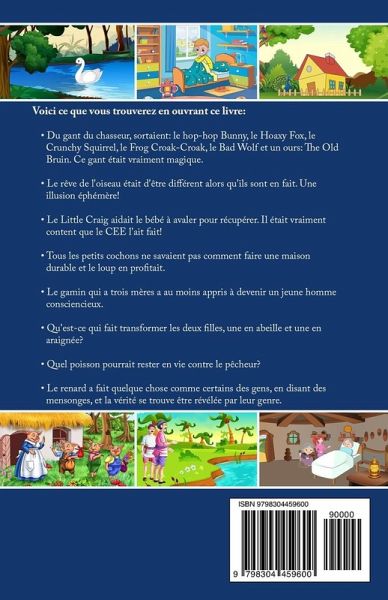 Voici ce que vous trouverez en ouvrant ce livre: - Du gant du chasseur, sortaient: le hop-hop Bunny, le Hoaxy Fox, le Crunchy Squirrel, le Frog Croak-Croak, le Bad Wolf et un ours: The Old Bruin. Ce gant était vraiment magique. Le rêve de l'oiseau était d'être différent alors qu'ils sont en fait. Une illusion éphémère! -Le Little Craig aidait le bébé à avaler pour récupérer. Il était vraiment content que le CEE l'ait fait! - Tous les petits cochons ne savaient pas comment faire une maison durable et le loup en profitait. - Le gamin qui a trois mères a au moins appris à devenir un jeune homme consciencieux. - Qu'est-ce qui fait transformer les deux filles, une en abeille et une en araignée? - Quel poisson pourrait rester en vie contre le pêcheur? --Le renard a fait quelque chose comme certains des gens, en disant des mensonges, et la vérité se trouve être révélée par leur genre.