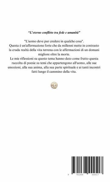 "L'eterno conflitto tra fede e umanità" "L'uomo deve pur credere in qualche cosa". Questa è un'affermazione forte che da millenni mette in contrasto la cruda realtà della vita terrena con le affermazioni di un domani migliore oltre la morte. Le mie riflessioni su questo tema hanno dato come frutto questa raccolta di poesie su temi che appartengono all'uomo, alle sue emozioni, alla sua anima, alla sua parte spirituale e ai tanti incontri fatti lungo il cammino della vita.