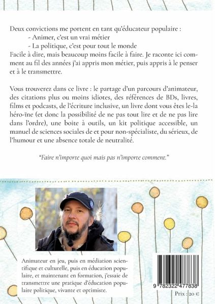 Deux convictions me portent en tant qu'éducateur populaire : - Animer, c'est un vrai métier - La politique, c'est pour tout le monde Facile à dire, mais beaucoup moins facile à faire. Je raconte ici comment au fil des années j'ai appris mon métier, puis appris à le penser et à le transmettre. Vous trouverez dans ce livre ce que j'aurais aimé trouver en commençant à animer : le partage d'un parcours d'animateur, des citations plus ou moins idiotes, des références de BDs, livres, films et podcasts, de l'écriture inclusive, un livre dont vous êtes le-la héro-ïne (et donc la possibilité de ne pas tout lire et de ne pas lire dans l'ordre), une boite à outils, un kit politique accessible, un manuel de sciences sociales de et pour non-spécialistes, du sérieux, de l'humour et une absence totale de neutralité.