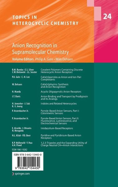 Brett M. Rambo Eric S. Silver Christopher W. Bielawski Jonathan L. SesslerCovalent Polymers Containing Discrete Heterocyclic Anion ReceptorsPhilip A. Gale Chang-Hee LeeCalix[n]pyrroles as Anion and Ion-Pair ComplexantsWim DehaenCalix[n]phyrins: Synthesis and Anion RecognitionHiromitsu MaedaAcyclic Oligopyrrolic Anion ReceptorsJeffery T. DavisAnion Binding and Transport by Prodigiosin and Its AnalogsHemraj Juwarker Jae-min Suk Kyu-Sung JeongIndoles and Related HeterocyclesPavel Anzenbacher Jr.Pyrrole-Based Anion Sensors, Part I: Colorimetric SensorsPavel Anzenbacher Jr.Pyrrole-Based Anion Sensors, Part II: Fluorescence, Luminescence, and Electrochemical SensorsErmitas Alcalde Immaculada Dinarès Neus MesquidaImidazolium-Based ReceptorsNathan L. Kilah Paul D. BeerPyridine and Pyridinium-Based Anion ReceptorsKevin P. McDonald Yuran Hua Amar H. Flood1,2,3-Triazoles and the Expanding Utility of Charge Neutral CHlllAnion Interactions