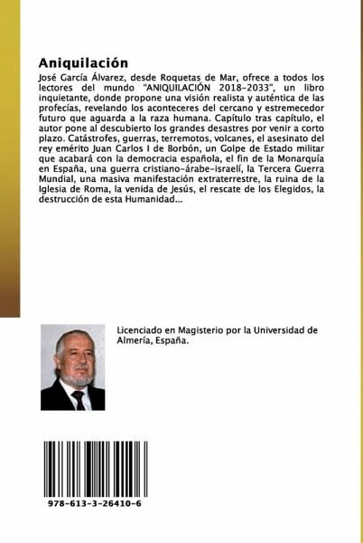 José García Álvarez, desde Roquetas de Mar, ofrece a todos los lectores del mundo "ANIQUILACIÓN 2018-2033", un libro inquietante, donde propone una visión realista y auténtica de las profecías, revelando los aconteceres del cercano y estremecedor futuro que aguarda a la raza humana. Capítulo tras capítulo, el autor pone al descubierto los grandes desastres por venir a corto plazo. Catástrofes, guerras, terremotos, volcanes, el asesinato del rey emérito Juan Carlos I de Borbón, un Golpe de Estado militar que acabará con la democracia española, el fin de la Monarquía en España, una guerra cristiano-árabe-israelí, la Tercera Guerra Mundial, una masiva manifestación extraterrestre, la ruina de la Iglesia de Roma, la venida de Jesús, el rescate de los Elegidos, la destrucción de esta Humanidad...