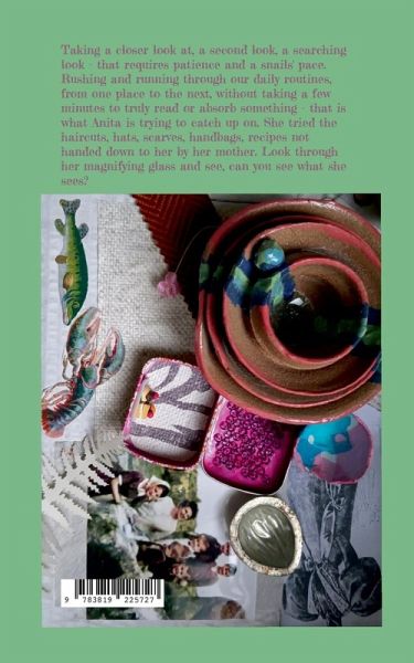 Taking a closer look at, a second look, a searching look - that requires patience and a snails' pace. Rushing and running through our daily routines, from one place to the next, without taking a few minutes to truly read or absorb something - that is what Anita is trying to catch up on. She tried the haircuts, hats, scarves, handbags, recipes not handed down to her by her mother. Look through her magnifying glass and see, can you see what she sees?