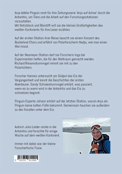 Anja Adélie-Pinguin reist für ihre Zeitungsserie 'Anja auf Achse'durch die Antarktis, um Tiere und die Arbeit auf denForschungsstationen vorzustellen.Mit Notizblock und Bleistift will sie die kleinen Großartigkeitendes weißen Kontinents für ihre Leser erzählen.Auf der ersten Station ihrer Reise lauscht sie einem Konzert desBuckelwal-Chors und erfährt von Polarforscherin Nadja, wie maneinen Wal misst.Auf der Neumeyer-Station darf sie Forscherin Inga beiExperimenten helfen, die für den Weltraum gemacht werden.Richard Riesensturmvogel nimmt sie mit zu denPolarlichtern.Forscher Hannes untersucht am Südpol das Eis derVergangenheit und kennt die Geschichten der erstenAbenteurer. Sandy Schneesturmvogel erklärt, was passiert,wenn es zu warm wird in der Antarktis und das Eis zuschmelzen beginnt.Pinguin-Experte Johann weiß, warum Anja als Pinguin keinekalten Füße bekommt. Gemeinsam tauchen sie zu den Korallen unter dem Eis.