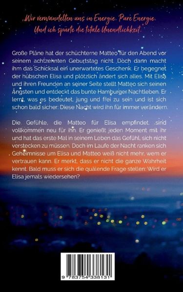 Große Pläne hat der schüchterne Matteo für den Abend vor seinem achtzehnten Geburtstag nicht. Doch dann macht ihm das Schicksal ein unerwartetes Geschenk. Er begegnet der hübschen Elisa und plötzlich ändert sich alles. Mit Elisa und ihren Freunden an seiner Seite stellt Matteo sich seinen Ängsten und entdeckt das bunte Hamburger Nachtleben. Er lernt, was es bedeutet, jung und frei zu sein und ist sich schon bald sicher: Diese Nacht wird ihn für immer verändern.Die Gefühle, die Matteo für Elisa empfindet, sind vollkommen neu für ihn. Er genießt jeden Moment mit ihr und hat das erste Mal in seinem Leben das Gefühl, sich nicht verstecken zu müssen. Doch im Laufe der Nacht ranken sich Geheimnisse um Elisa und Matteo weiß nicht mehr, wem er vertrauen kann. Er merkt, dass er nicht die ganze Wahrheit kennt. Bald muss er sich die quälende Frage stellen: Wird er Elisa jemals wiedersehen?