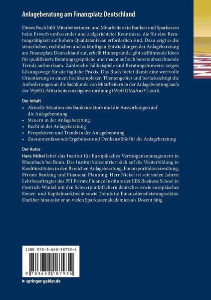 Dieses Buch hilft Mitarbeiterinnen und Mitarbeitern in Banken und Sparkassen beim Erwerb umfassender Kenntnisse und zielgerichteter Kenntnisse, die für eine Beratungstätigkeit auf hohem Qualitätsniveau erforderlich sind. Dazu zeigt es die steuerlichen, rechtlichen und zukünftigen Entwicklungen der Anlageberatung am Finanzplatz Deutschland auf, erhellt Hintergründe, gibt zielführende Ideen für qualifizierte Beratungsgespräche und macht auf sich bereits abzeichnende Trends aufmerksam. Zahlreiche Fallbeispiele und Beratungshinweise zeigen Lösungswege für die tägliche Praxis auf. Das Buch bietet damit eine wertvolle Orientierung in einem hochkomplexen Themengebiet und berücksichtigt die Anforderungen an die Sachkunde des Mitarbeiters in der Anlageberatung nach der WpHG-Mitarbeiteranzeigeverordnung. (WpHGMaAnzV).
