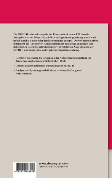Die MiFID II sieht auf europäischer Ebene weitreichende Pflichten für Anlageberater vor. Die privatrechtliche Anlageberatungshaftung wird derzeit jedoch durch die nationalen Rechtsordnungen geregelt. Die vorliegende Arbeit untersucht die Haftung von Anlageberatern im deutschen, englischen und italienischen Recht. Sie reflektiert die privatrechtlichen Auswirkungen der MiFID II und erwägt eine weitergehende Rechtsangleichung.