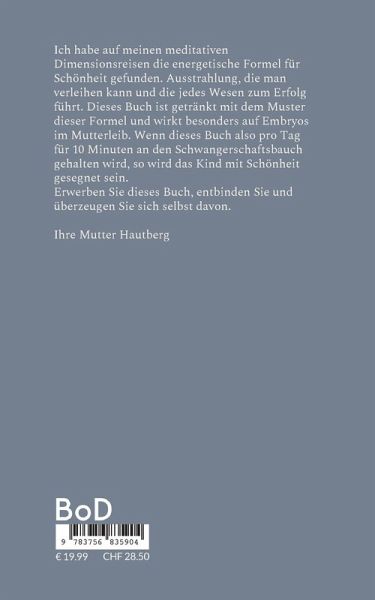Ich habe auf meinen meditativen Dimensionsreisen die energetische Formel für Schönheit gefunden. Ausstrahlung, die man verleihen kann und die jedes Wesen zum Erfolg führt. Dieses Buch ist getränkt mit dem Muster dieser Formel und wirkt besonders auf Embryos im Mutterleib. Wenn dieses Buch also pro Tag für 10 Minuten an den Schwangerschaftsbauch gehalten wird, so wird das Kind mit Schönheit gesegnet sein. Erwerben Sie dieses Buch, entbinden Sie und überzeugen Sie sich selbst davon. Ihre Mutter Hautberg