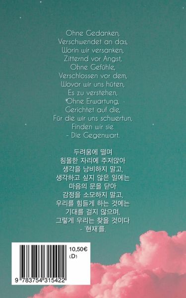 Gedichte von Madeleine Hold mit koreanischer Übersetzung von Yulim Kim: "Ohne Gedanken, verschwendet an das, worin wir versanken, zitternd vor Angst, ohne Gefühle, verschlossen vor dem, wovor wir uns hüten, es zu verstehen, ohne Erwartung, gerichtet auf die, für die wir uns schwertun, finden wir sie - die Gegenwart."Sämtliche Texte wurden bereits in 'Ohne Kleider', einem gemeinsamen Werk von Madeleine Hold und Co-Autorin Jill Graf, veröffentlicht und sind hier sowohl in deutscher als auch in koreanischer Sprache neu herausgegeben.