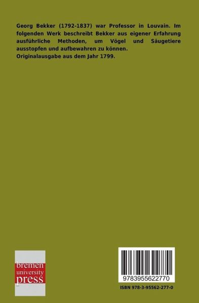 Georg Bekker (1792-1837) war Professor in Louvain. Im folgenden Werk beschreibt Bekker aus eigener Erfahrung ausführliche Methoden, um Vögel und Säugetiere ausstopfen und aufbewahren zu können. Originalausgabe aus dem Jahr 1799.