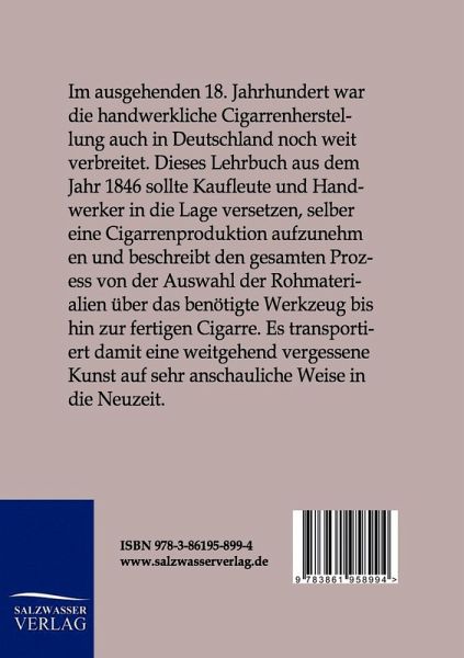 Im ausgehenden 18. Jahrhundert war die handwerkliche Cigarrenherstellung auch in Deutschland noch weit verbreitet. Dieses Lehrbuch aus dem Jahr 1846 sollte Kaufleute und Handwerker in die Lage versetzen, selber eine Cigarrenproduktion aufzunehmen und beschreibt den gesamten Prozess von der Auswahl der Rohmaterialien über das benötigte Werkzeug bis hin zur fertigen Cigarre. Es transportiert damit eine weitgehend vergessene Kunst auf sehr anschauliche Weise in die Neuzeit.