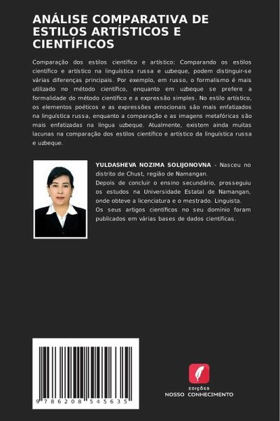 Comparação dos estilos científico e artístico: Comparando os estilos científico e artístico na linguística russa e uzbeque, podem distinguir-se várias diferenças principais. Por exemplo, em russo, o formalismo é mais utilizado no método científico, enquanto em uzbeque se prefere a formalidade do método científico e a expressão simples. No estilo artístico, os elementos poéticos e as expressões emocionais são mais enfatizados na linguística russa, enquanto a comparação e as imagens metafóricas são mais enfatizadas na língua uzbeque. Atualmente, existem ainda muitas lacunas na comparação dos estilos científico e artístico da linguística russa e uzbeque.
