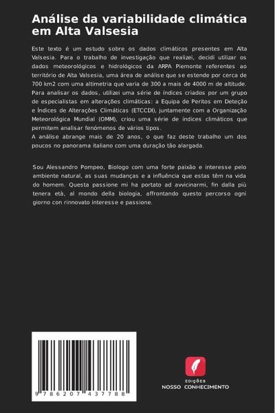 Este texto é um estudo sobre os dados climáticos presentes em Alta Valsesia. Para o trabalho de investigação que realizei, decidi utilizar os dados meteorológicos e hidrológicos da ARPA Piemonte referentes ao território de Alta Valsesia, uma área de análise que se estende por cerca de 700 km2 com uma altimetria que varia de 300 a mais de 4000 m de altitude.Para analisar os dados, utilizei uma série de índices criados por um grupo de especialistas em alterações climáticas: a Equipa de Peritos em Deteção e Índices de Alterações Climáticas (ETCCDI), juntamente com a Organização Meteorológica Mundial (OMM), criou uma série de índices climáticos que permitem analisar fenómenos de vários tipos.A análise abrange mais de 20 anos, o que faz deste trabalho um dos poucos no panorama italiano com uma duração tão alargada.