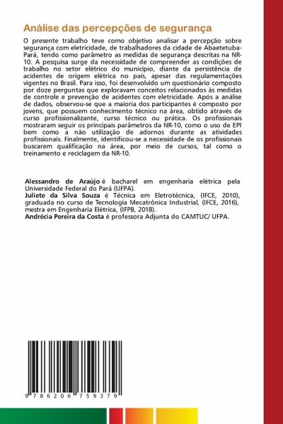 O presente trabalho teve como objetivo analisar a percepção sobre segurança com eletricidade, de trabalhadores da cidade de Abaetetuba-Pará, tendo como parâmetro as medidas de segurança descritas na NR-10. A pesquisa surge da necessidade de compreender as condições de trabalho no setor elétrico do município, diante da persistência de acidentes de origem elétrica no país, apesar das regulamentações vigentes no Brasil. Para isso, foi desenvolvido um questionário composto por doze perguntas que exploravam conceitos relacionados às medidas de controle e prevenção de acidentes com eletricidade. Após a análise de dados, observou-se que a maioria dos participantes é composto por jovens, que possuem conhecimento técnico na área, obtido através de curso profissionalizante, curso técnico ou prática. Os profissionais mostraram seguir os principais parâmetros da NR-10, como o uso de EPI bem como a não utilização de adornos durante as atividades profissionais. Finalmente, identificou-se a necessidade de os profissionais buscarem qualificação na área, por meio de cursos, tal como o treinamento e reciclagem da NR-10.